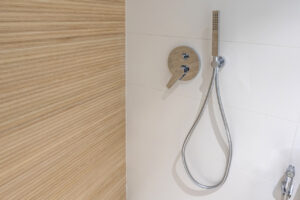 - Baños modernos con plato de ducha de resina y grifería monomando.